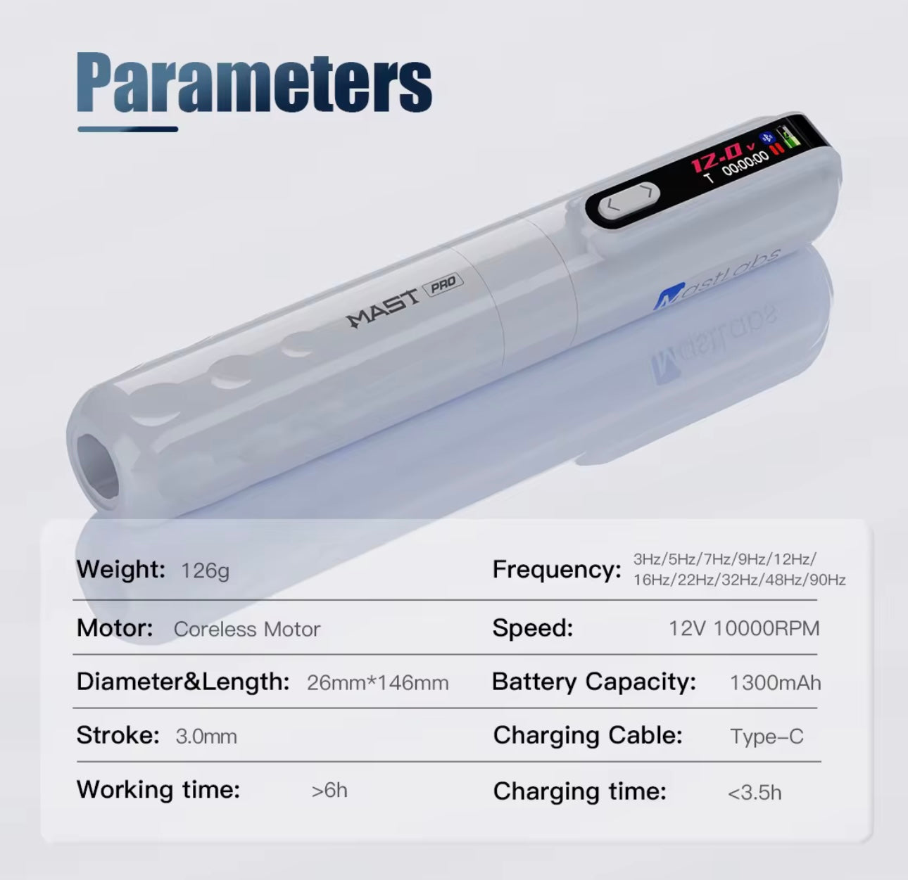 Meet the Mast Y22 Pro. A wireless, Bluetooth enabled powerhouse that delivers ultra smooth performance in a sleek, light weight, compact design. Whether youre creating flawless brows, fine line tattoos, or advanced paramedical work, this machine keeps up with you. Its lighter, quieter, more powerful, and smoother than anything youve used before.